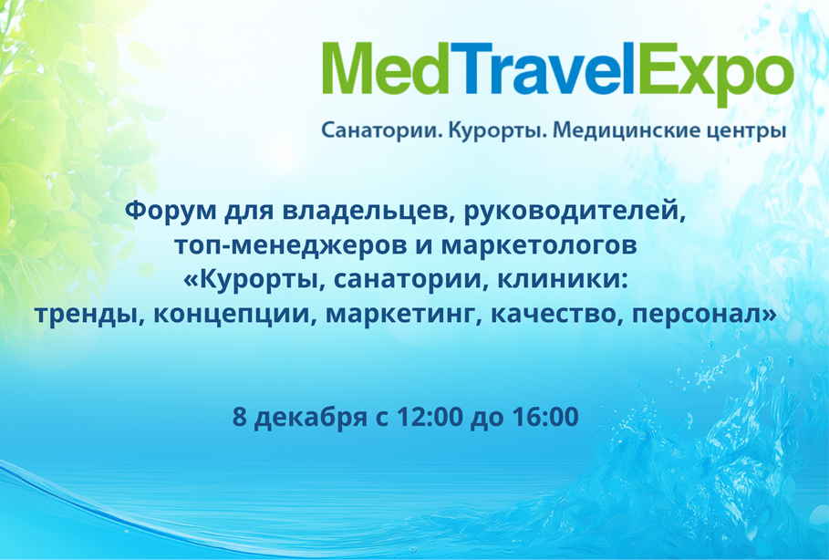 8 декабря 2025 г. в рамках деловой программы 8-й международной выставки «MedTravelExpo. Санатории. Курорты. Медицинские центры» с 12:00 до 16:00 пройдет Форум для владельцев, руководителей, топ-менеджеров и маркетологов «Курорты, санатории, медцентры: тренды, концепции, маркетинг, качество, персонал», который соберет ведущих отраслевых спикеров и экспертов медицинского и оздоровительного туризма в области сервиса.
